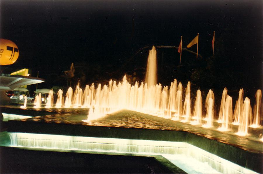 엑스포 햇빛 가리개와 엑스포 타워 나이트 컴패니언, 모노레일이 뚜렷하게 보이며, 월드 엑스포 공원의 놀이기구 일부와 '입체파 선단'도 보인다.