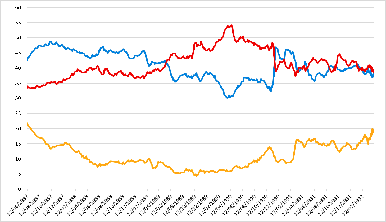 1987년 영국 총선에서 마거릿 대처 총리가 이끄는 보수당은 압승을 거두며 세 번째 임기를 시작했다. 그러나 임기 말, 당내 분열과 커뮤니티 차지(일명 인두세) 도입에 대한 거센 반발, 그리고 심화되는 경기 침체로 인해 대처 정부의 지지율은 급락했다. 반면 닐 키녹이 이끄는 노동당은 지지율을 회복하며 보수당을 앞서기 시작했다.