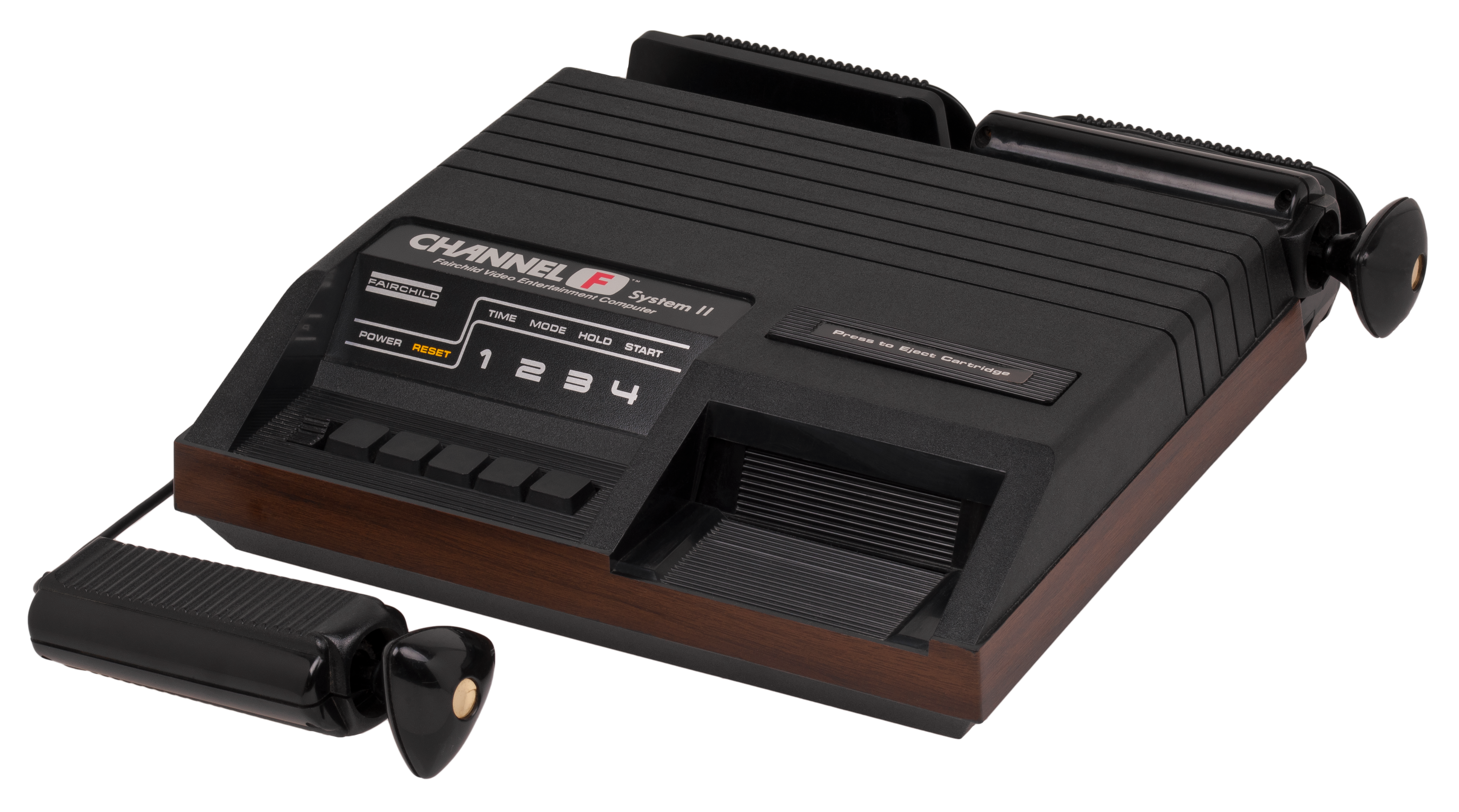 페어차일드 채널 F는 초기에는 페어차일드 비디오 엔터테인먼트 시스템(VES)으로도 알려졌으며, 1976년 11월에 페어차일드 반도체에서 발매된 제2세대 최초의 게임기이다.[258] 이는 세계 최초로 CPU를 탑재한 비디오 게임기이며, 카트리지를 이용한 게임 코드 저장 방식을 도입했다.[27] 이 게임기에는 일시 정지 버튼이 탑재되어 있어, 이 버튼 덕분에 게임기의 전원을 끄거나 재설정할 필요 없이 플레이어는 현재 게임 진행 상황을 유지한 채 휴식을 취할 수 있었다.[28] 페어차일드는 채널 F용으로 26종의 카트리지를 발매했으며, 각각 최대 4개의 게임이 수록되어 있었다. 게임기에는 ''하키''와 ''테니스''의 2가지 게임이 미리 설치되어 있었다.[29]