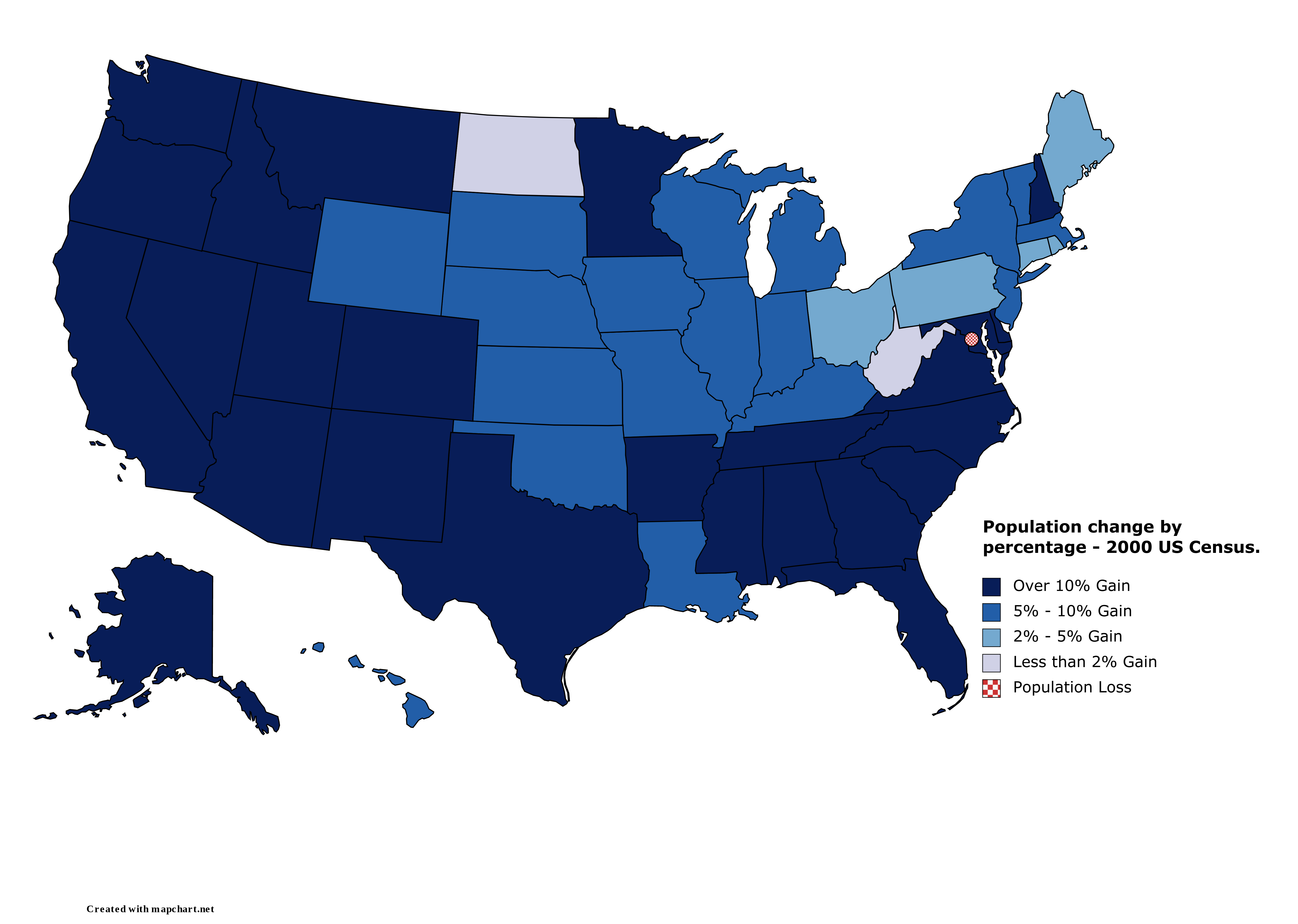 미국 남부와 미국 서부는 2000년 미국 인구 조사의 대부분을 차지했는데, 각각 14,790,890명과 10,411,850명이 증가했다. 이는 미국 인구의 평균 중심이 미주리주의 펠프스 군으로 이동했음을 의미한다. 미국 북동부는 2,785,149명, 미국 중서부는 4,724,144명 증가했다.