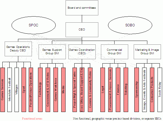 SOCOG의 내부 조직은 1998년 후반에는 주로 기능 중심으로 구성되었다가, 1999년에는 기능 영역(FA)이 지리적 구역 및 경기장 팀으로 분리되면서 매트릭스 구조로 전환되었다.