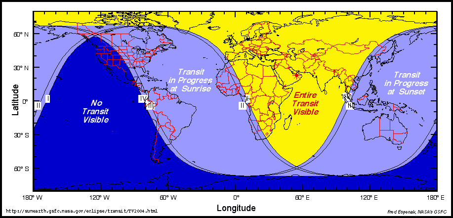 유럽, 아시아 대부분, 아프리카 거의 전 지역에서 일면통과 전체 과정을 관측할 수 있었다. 아시아 최동단과 호주에서는 해가 지기 전에 일면통과 시작을 관측할 수 있었고, 아프리카 서부, 북아메리카 동부, 남아메리카 대부분 지역에서는 해가 뜬 후 일면통과 종료를 관측할 수 있었다. 서부 북아메리카, 남아메리카 남부, 하와이, 뉴질랜드에서는 일면통과를 전혀 관측할 수 없었다.