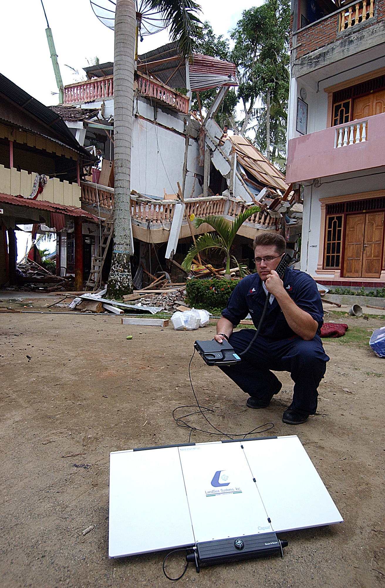 구호 활동을 위해 니아스섬에 설치된 위성 전화의 통신 연결을 점검하는 모습.