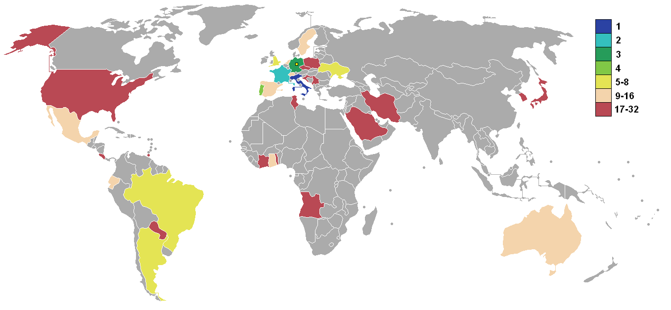 2006년 FIFA 월드컵 본선에는 32개국이 진출했다.[164] 각국의 2006년 5월 17일 기준 FIFA 랭킹은 다음과 같다.[164]