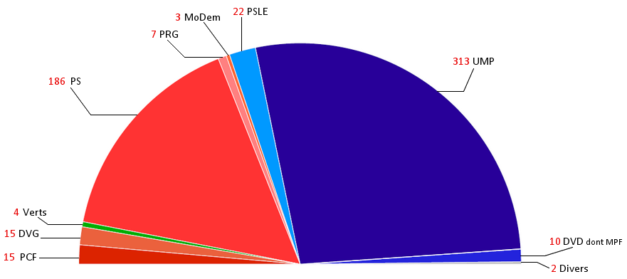 니콜라 사르코지 대통령이 소속된 여당 대중운동연합은 국민 의회에서 과반수를 차지했다. 제1차 투표에서 대중운동연합은 40%에 가까운 득표율을 획득해 야당 제1당인 사회당을 크게 앞섰다. 제2차 투표에서 여당의 압승이 예상되었으나, 사회당이 선전하면서 여당은 의석이 줄고 사회당은 46석을 늘렸다. 여당이 안정적인 다수를 차지했지만, 사르코지 정권에 대한 국민의 평가는 다소 엄격했다.