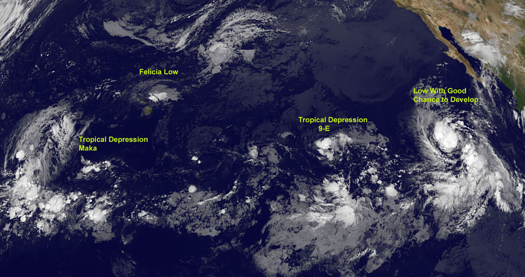 - 제7호 열대폭풍 엔리케: 8월 3일 발생, 8월 7일 소멸. 발생 초기에는 추가적인 발달이 예상되었으나, 허리케인 펠리시아와의 상호 작용으로 약화되었다.[43][44]