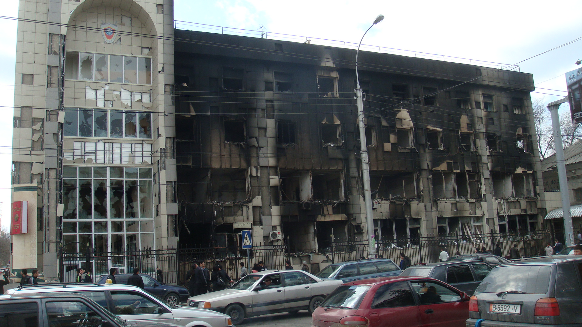 2010년 4월 7일 키르기스스탄 비슈케크에서 도시 전체의 시위와 폭동 중에 수도 건물 근처에서 불타고 있는 반대파가 점령한 차량. 경비병들이 연기 왼쪽에 보인다.