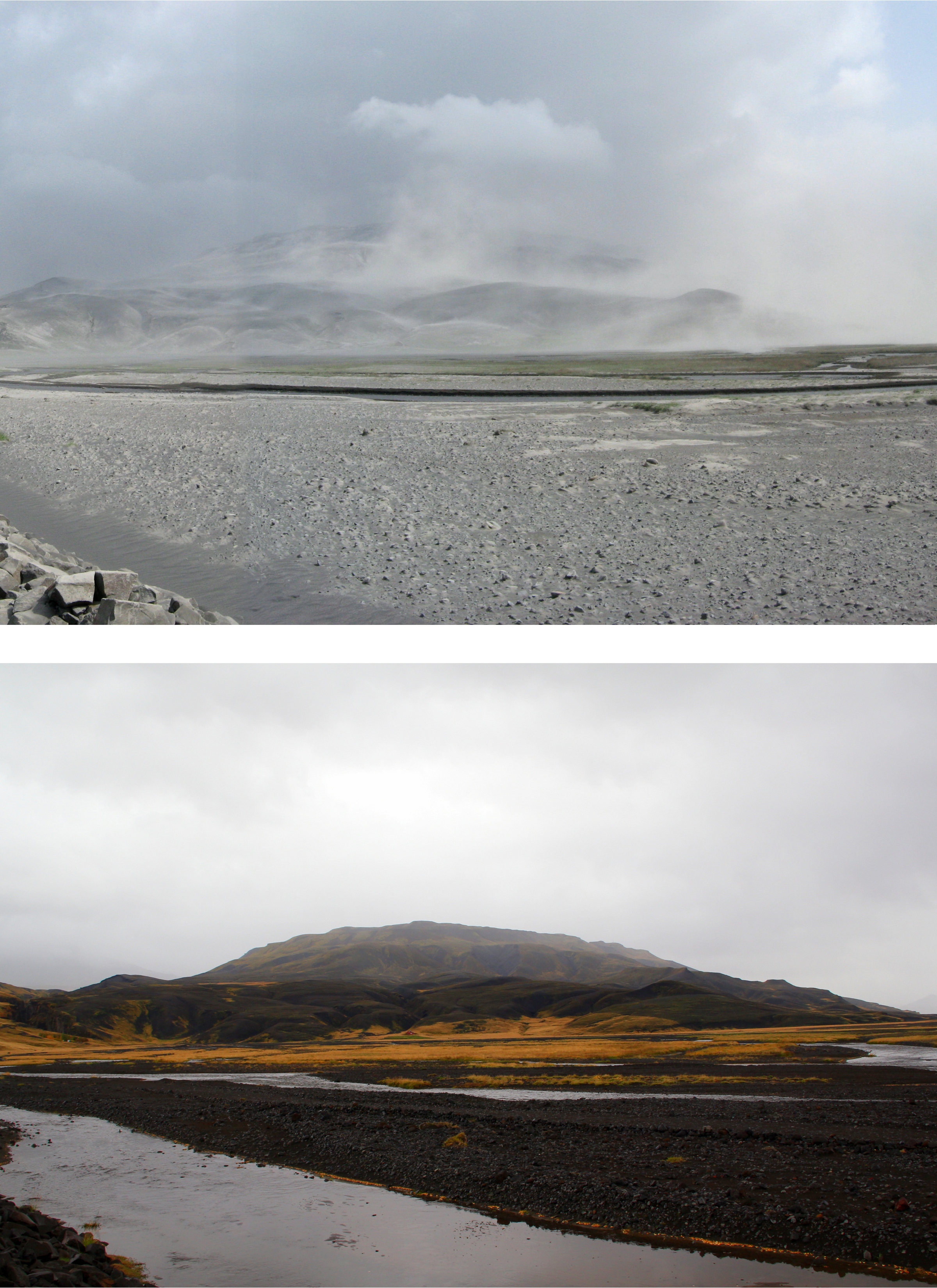 빙하 배출구인 기그외퀴들 아래로 홍수에 의해 운반된 기그외퀴들슬론의 빙하 호수를 채운 테프라 | 10e6 |