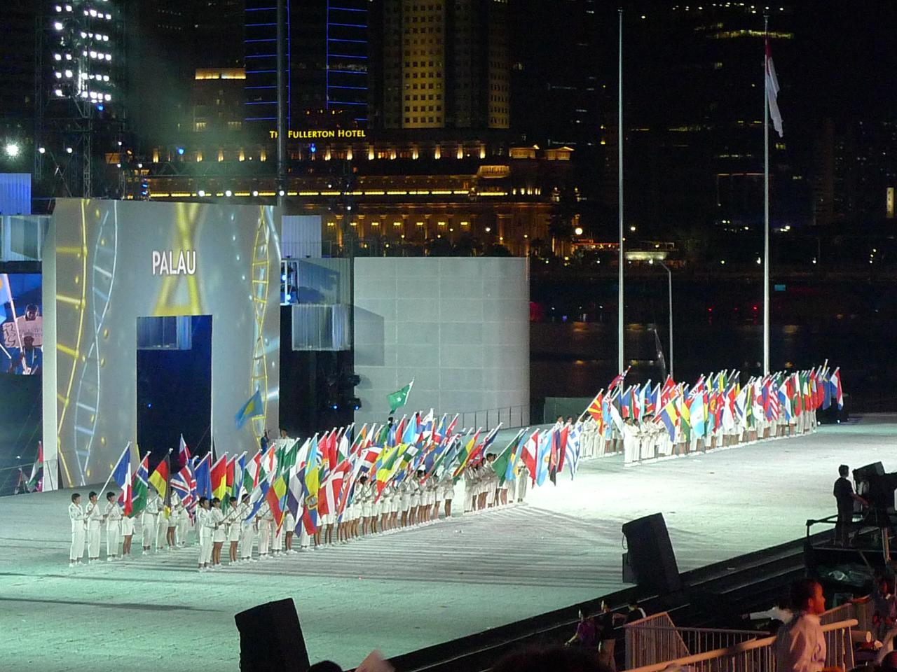 프리 쇼 준비와 어린이와 젊은 드러머들이 이끄는 카운트다운에 이어, 쇼는 행사 연도를 의미하는 20:10 hrs (UTC+8)[34][35]에 불꽃놀이와 함께 시작되었다. 이어서 중국계 싱가포르인, 말레이계 싱가포르인 및 인도계 싱가포르인 출연진이 등장하는 "Selamat Datang|슬라맛 다탕my"이라는 문화 공연이 이어졌다. 이 공연은 싱가포르의 전통과 현대성의 조화를 상징하는 유라시아계 싱가포르인과 페라나칸 유산의 싱가포르 출신 예술가들의 공연으로 마무리되었다. 관객들은 여러 올림픽 홍보대사들의 사전 녹음된 메시지를 들었는데, 우사인 볼트, 마이클 펠프스, 옐레나 이신바예바, 밴드 서티 세컨즈 투 마스의 멤버들, 배우 성룡, 이연걸이 메시지를 보냈다. 싱가포르 국기는 싱가포르 청소년 축제 중앙 심사 디스플레이 밴드 대회 2010에서 올해의 디스플레이 밴드 상과 올해의 최고 드럼 메이저 상을 수상한 데이 군악대와 함께 무대에 등장하여 "Five Stars Arising"을 연주했고, 국가가 게양되는 동안 국가를 연주했다.[31]