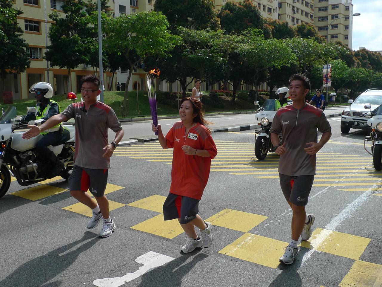 성화는 높이가 60cm, 폭은 5cm에서 8cm 사이, 무게는 0.74kg이다.[27] 13일 동안 세계를 순회한 후, 싱가포르에서 6일 동안 성화 봉송이 더 진행되었다.[29] 리콴유 장관 멘토는 싱가포르 성화 봉송 마지막 날인 2010년 8월 13일 마리나 베이 산책로에 있는 이동식 화로에 불을 붙였다.[28]