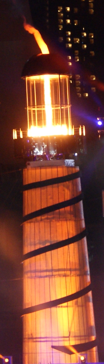 32m 높이의 성화대는 싱가포르 과학 센터의 연구원이자 발명가인 Dr. Tsai Her-Mann이 설계했다. 등대처럼 보이도록 설계되었으며, 상단에 구멍이 있는 튜브 내부의 소용돌이 8m 불기둥인 "소용돌이 불꽃" 또는 "불의 토네이도"가 특징이다. 300°C에 도달할 수 있는 뜨거운 공기가 불꽃 주위에서 상승하여 타워 기저부의 구멍에서 차가운 공기를 위로 끌어올렸다. 타워의 유리 패널 부분 바로 아래에서 차가운 공기는 각진 가이드 베인을 통해 밀려 올라가 20m/s로 위로 이동하는 나선형 운동을 생성했다. 싱가포르와 미국에서 특허를 받은 성화대는 약 2MW의 연료를 소비했는데, 이는 기존 올림픽 성화대가 사용하는 양의 절반에도 미치지 못한다. Dr. Tsai는 자신의 디자인이 향후 다른 올림픽 행사에 사용될 수 있기를 바란다고 말했다. 개막식 전 두 달 동안 오전 4시에 성화대를 비밀리에 테스트했다.[38]