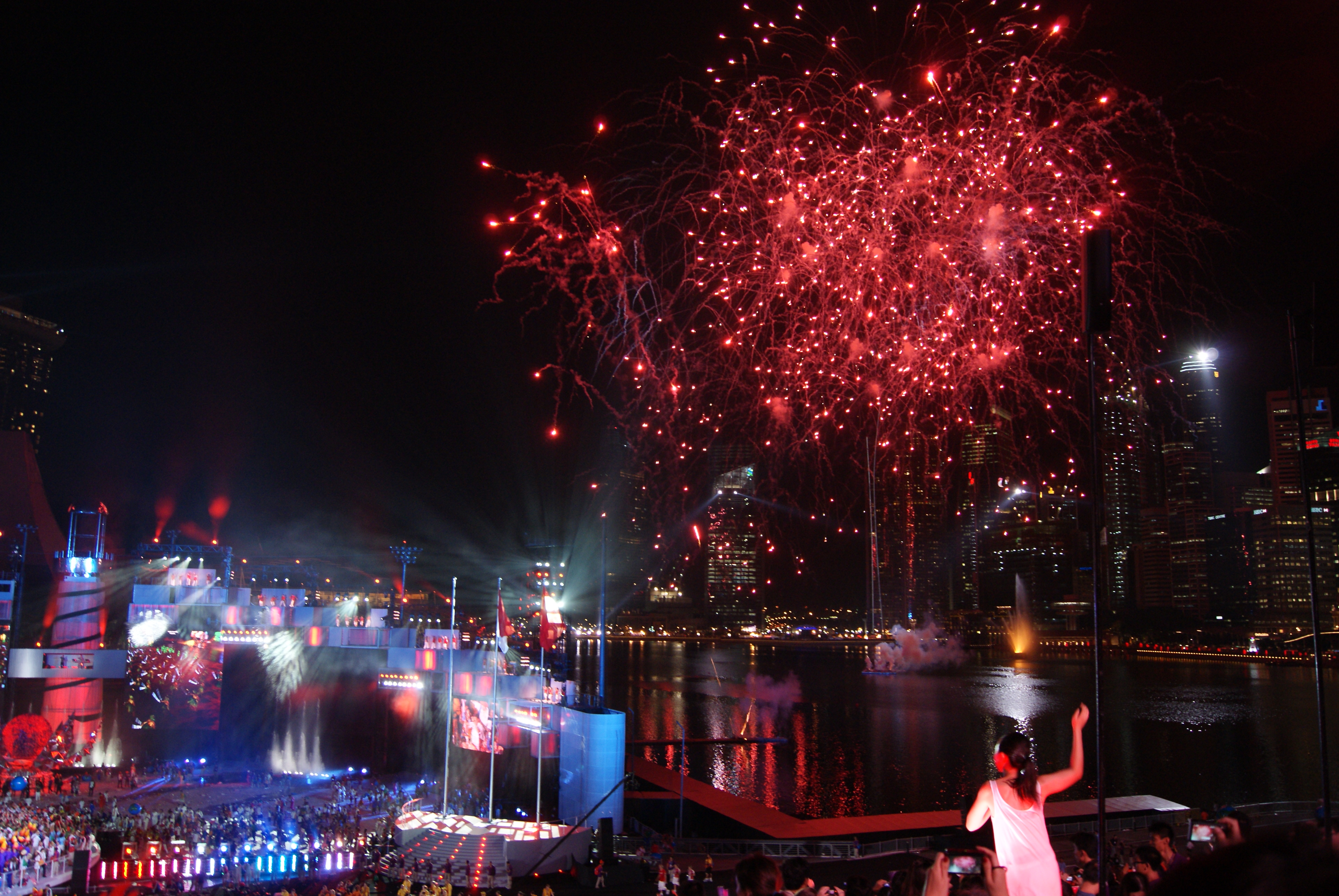 싱가포르의 역사에 관한 "기원" 부문에서 출연진들은 초기 이민자들의 도착을 묘사하기 위해 화물 컨테이너에 들어가 무대에 등장했다. 이 행사는 1940년대부터 현재까지의 인기 있는 노래를 특징으로 하는 댄스 공연으로 이어졌다. "괴물"이라는 부제는 거대한 괴물과 싸워야 하는 젊은 권투 선수의 이야기를 들려주었다. 그는 실랏 전사들을 괴물과 싸우도록 소환했지만 실패했고, 칼라리 전사와 우슈 전사들을 소환했을 때도 실패했다. 그러나 곧 그는 내면의 두려움을 극복하고 거대한 괴물을 물리쳤다.[31] 싱어 송라이터 시아 웨이 웬은 반사 수영장 중앙에서 Mayuni Omar & Mathilda D Silva가 작곡한 "Across The Finish Line"을 공연했다. 이어서 용을 용기와 힘, 지혜의 상징으로 묘사한 "Playing with Fire"가 이어졌다. 이 부문에서는 싱가포르 창가학회 출신 청소년 500명이 참여하여 다양한 물고기에서 용을 만들었다.[36] 글로벌 협력의 주제를 반영하여, 싱가포르 게임의 세계 청소년 오케스트라 단원들은 전 세계의 다양한 악기를 특징으로 하는 오케스트라 곡을 연주했다. 오케스트라는 싱가포르 심포니 오케스트라의 젊은 부지휘자인 다렐 앙이 이끌었다. 다음 부문인 "Bud"는 희망과 젊어짐의 상징으로 비를 묘사했다. 쇼 부문의 마지막은 엑스-디의 마커스 리와 린 킴 셀비가 행사에서 위촉된 "A New Story"를 공연하는 것으로 마무리되었으며, LASALLE 예술 대학 학생들의 패션쇼가 함께했다.[37]