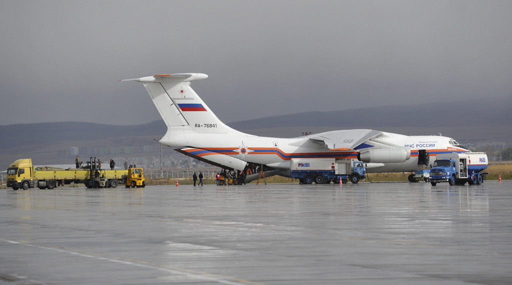 지진 피해자들에게 인도적 지원을 제공하기 위해 러시아 응급 상황부의 Il-76 항공기가 에르주룸 터키 공항에 도착한 모습.