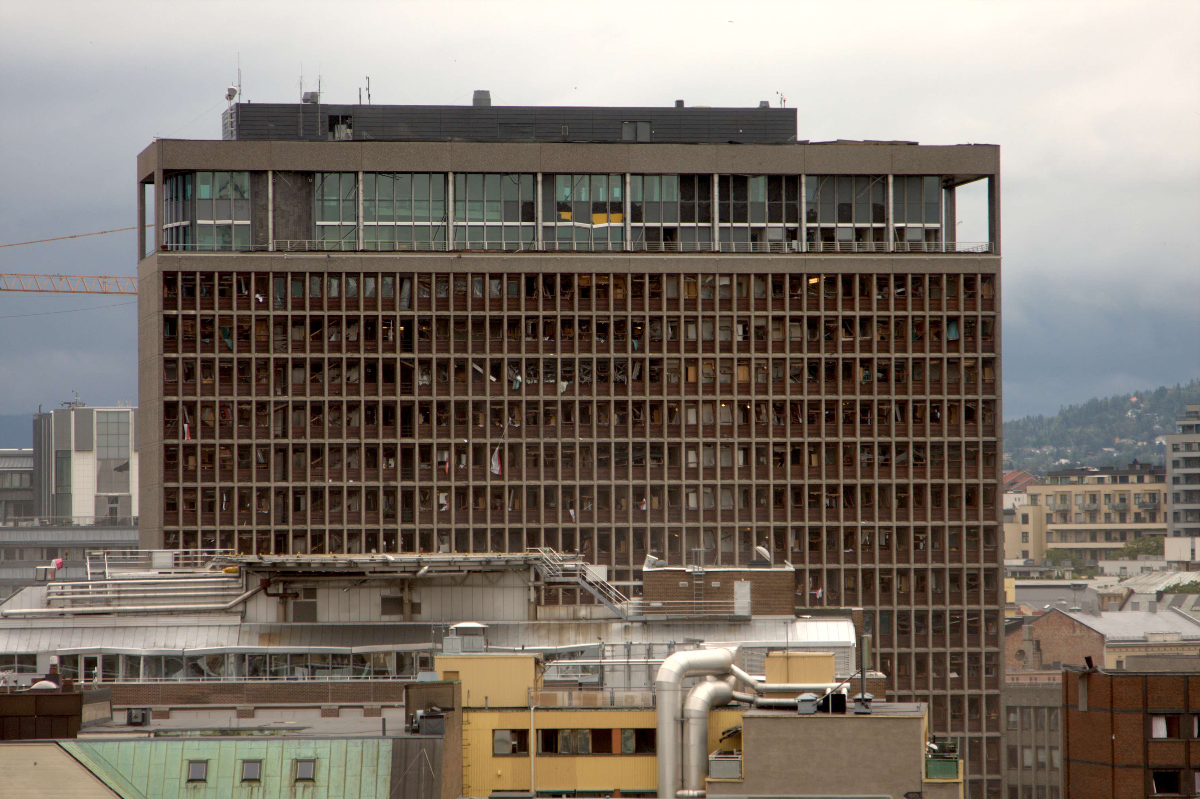 폭발로 H 블록(H-blokkano)과 R4에 불이 났고, 충격파로 모든 층의 창문은 물론 광장 건너편 VG 건물과 다른 건물들의 창문도 깨졌다.[62] 폭발 장면은 많은 보안 카메라에 포착되었다.[63] 그 지역 거리는 유리와 파편으로 가득 찼고, 석유에너지부에서는 불이 계속 타면서 하얀 연기가 피어올랐다고 보고되었다. 폭발음은 최소 7km 떨어진 곳에서도 들렸다.[57]