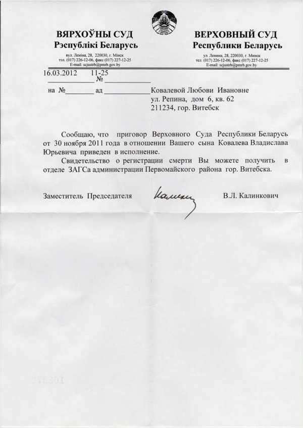 2011년 민스크 지하철 폭탄 테러의 가해자였던 울라지슬라우 코발료우의 어머니에게 아들의 처형을 알리기 위해 보낸 공식 서한