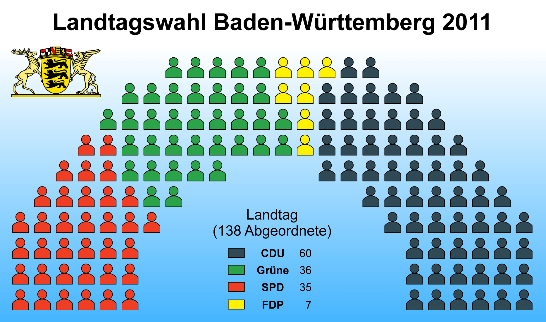 2011년 5월 12일, 빈프리트 크레치만이 바덴뷔르템베르크 주지사로 취임했다.[8] 크레치만은 독일 최초의 녹색당 출신 주지사가 되었다.[9][8] 주의회 주지사 투표에서 크레치만은 야당으로부터 최소 2표를 더 얻었다.[9]