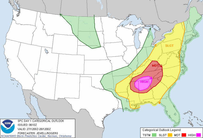 4월 27일 이른 아침(밤사이)부터 심각한 악천후가 계속되었으며, 사실상 하루 종일 끊임없이 이어졌다. 이틀 연속으로 SPC는 미국 남부에 심각한 악천후에 대한 고위험 경보를 발령했다. 그날 아침 늦게, SPC는 미시시피주 메리디안에서 앨라배마주 헌츠빌에 이르는 지역의 토네이도 발생 확률을 45%로 높였는데, 이는 고위험 기준을 초과하는 극히 드문 경우였다. 이처럼 극심한 토네이도 발생 시기 동안 토네이도가 발생하기에 매우 유리한 조건이 형성되었다.[39]
