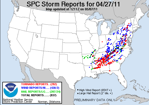 폭풍 예보 센터는 앞선 24시간 동안 292건의 토네이도 보고를 받았다.[60] 4월 27일 하루 동안 가장 많은 토네이도 발생 기록(223개, CDT 자정~자정(05:00~05:00 UTC))을 세웠으며, 4월 27~28일 00시 40분~00시 40분 CDT(05:40~05:40 UTC) 동안에는 226개의 토네이도가 발생하여 24시간 동안 가장 많은 토네이도 상륙 기록을 경신했다. 이는 1974년 슈퍼 아웃브레이크가 기록한 148개를 넘어선 것이다. 226개의 토네이도 중 59개가 앨라배마에 상륙했고, 83개가 테네시에서 시작되어 4월 27일에 상륙한 토네이도의 62.8%를 차지했다.[61] 4월 27일에만 앨라배마 주 헌츠빌의 국립 기상청은 92건의 토네이도 경보, 31건의 강력한 뇌우 경보 및 7건의 급격한 홍수 경보를 발령했다.[62]