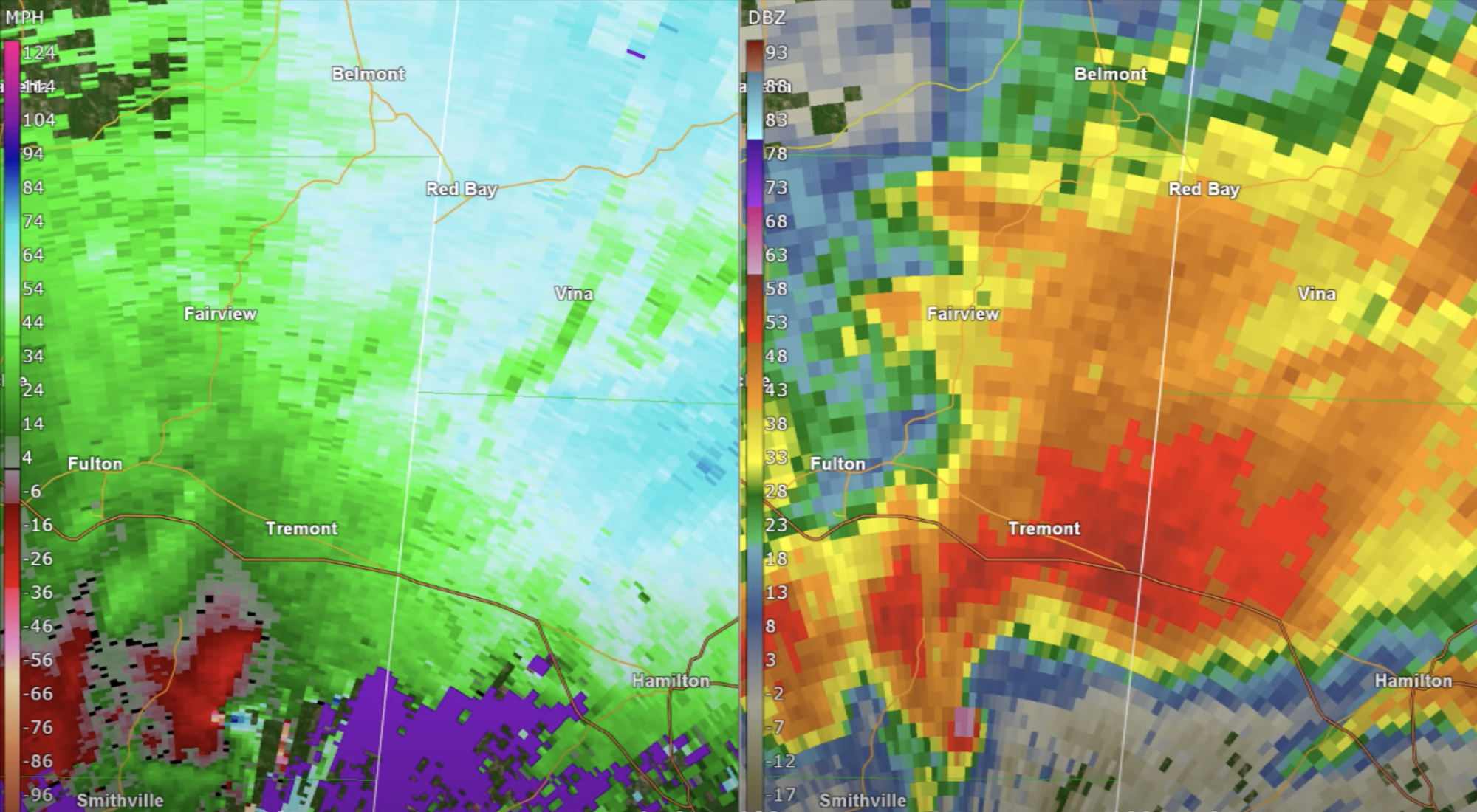CDT 오전 5시(UTC 10:00) 직후, 스콜 라인에 포함된 한 셀이 토네이도를 발생시키기 시작하여 앨라배마 베리를 강타하는 EF1 토네이도로 시작했다. 곧 코르도바 EF3 토네이도가 뒤따랐다.[46] 이 라인이 앨라배마 컬먼 카운티에 진입하면서 해당 셀, 즉 중규모 대류성 소용돌이 (MCV)가 콤마 머리 모양을 보이기 시작했고, 앨라배마 핸스빌 마을을 강타하여 한 명의 사망자를 낸 또 다른 장거리 EF2 토네이도를 발생시켰다. MCV는 이후 앨라배마 마샬 카운티에서 13개의 토네이도(대부분 EF1 등급)를 발생시켰으며, 이 중 많은 수가 동시에 발생했다.