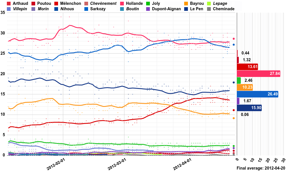 3월 19일, 헌법 회의에서 3월 16일까지 제출된 추천인 서명이 유효한지 확인한 후 10명을 공식 후보로 인정했다. 우파 여당인 국민운동연합(UMP)을 탈퇴하고 신당인 공화국 연대를 창당한 빌팽 전 총리는 출마를 표명했지만, 후보 등록에 필요한 500명의 추천을 받지 못해 포기했다. 극우 정당인 국민전선(FN)의 르펜 당수도 추천인 모집에 어려움을 겪었지만, 마감일 직전에 출마를 확정지었다.