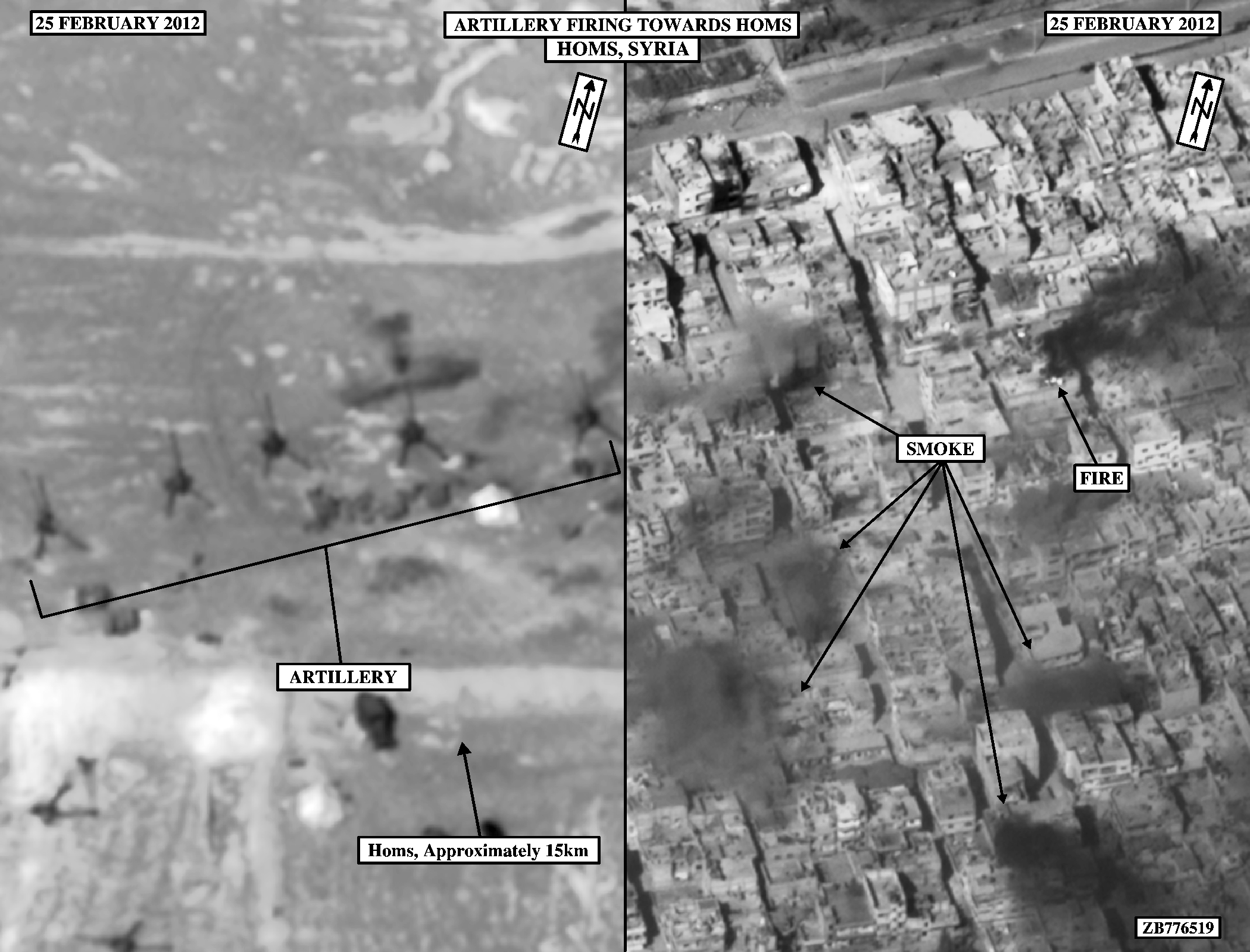 사망 전에 마지막으로 보낸 보고서에서 저널리스트 마리 콜빈은 식별된 군사 목표가 부족하여 많은 민간 건물들이 피해를 입었다고 말했다. 그녀의 보고서에 따르면 그녀가 본 사상자는 약 80%가 민간인이고 나머지는 자유 시리아군(FSA) 전투원이었다.[83]