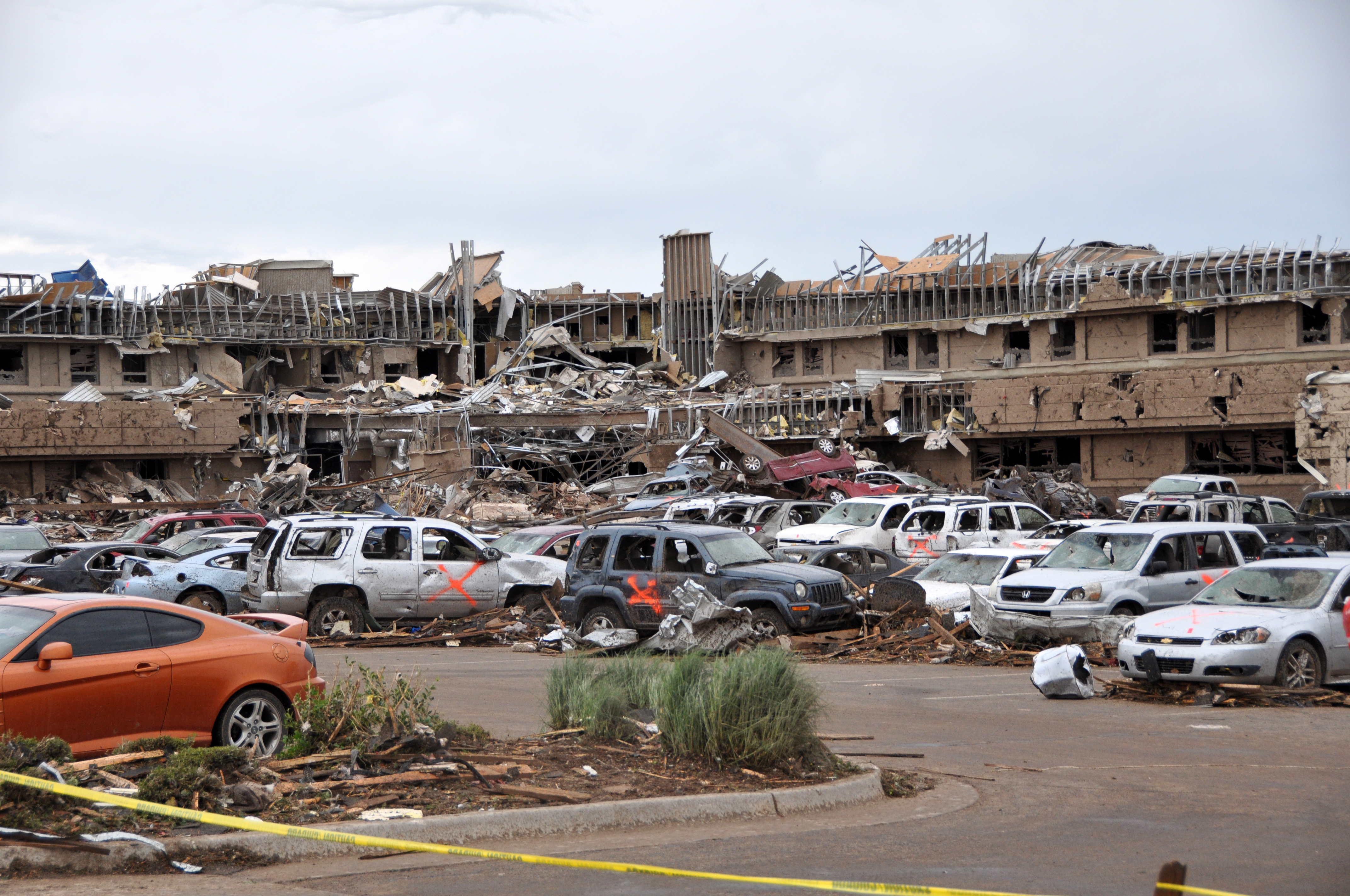 북동쪽으로 더 나아가자, 최소 12대의 차량이 EF4 피해를 입은 무어 메디컬 센터 정문 앞에 쌓여 있었다. 한 대의 차량이 공중으로 날아 지붕 위로 던져졌다. 메디컬 센터 근처 지역의 많은 가옥이 완전히 파괴되었으며, 앵커 볼트가 있는 잘 지어진 4채의 벽돌 가옥이 쓸려가 이 4채의 가옥에 대한 피해는 EF5로 평가되었다.[30]