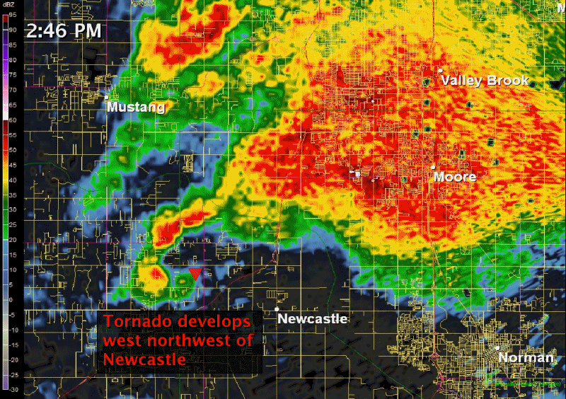 토네이도는 CDT(미국 중부 일광 절약 시간) 오후 2시 56분에 오클라호마주 맥클레인군 북서부, 뉴캐슬 시내에서 북서쪽으로 약 약 7.08km 떨어진 곳에서 시작되었다.[16] 처음에는 가늘고 밧줄 모양이었으나, SH-37을 건너기 전 한 가옥과 몇 그루의 나무에 EF1 피해를 입혔고, 반농촌 주택가가 강타하면서 급격히 강해져 여러 가옥이 파괴되었으며, 그중 두 채는 EF4 강도로 완전히 파괴되었다.[16] 이 시점에서 토네이도는 2분 동안 급격히 커지기 시작하여 밧줄 모양의 깔때기는 큰 스토브 파이프 모양으로 부풀어 오르기 시작했고, 더 나아가 통 모양으로 성숙해졌다. 잔해 구름이 깔때기 주위에 생겨났고, 마침내 거대한 쐐기 모양 구조로 진화했다. 이 지역에서 약간의 지면 깎임 현상이 시작되었고, 북동쪽으로 더 떨어진 주택가의 여러 가옥이 EF3 피해를 입었다.[17][18]CDT 오후 3시 1분, 국립 기상청은 오클라호마 시티 남부와 무어에 토네이도 비상 사태를 선포했다.[19][20] 트윈 레이크 이중 편파 NEXRAD 레이더는 토네이도가 클리블랜드군 북부의 오클라호마 시티 남부 지역으로 진입하면서 해당 갈고리 에코 내에서 직경 약 1.61km의 토네이도 잔해 신호를 감지했다.[19][20]