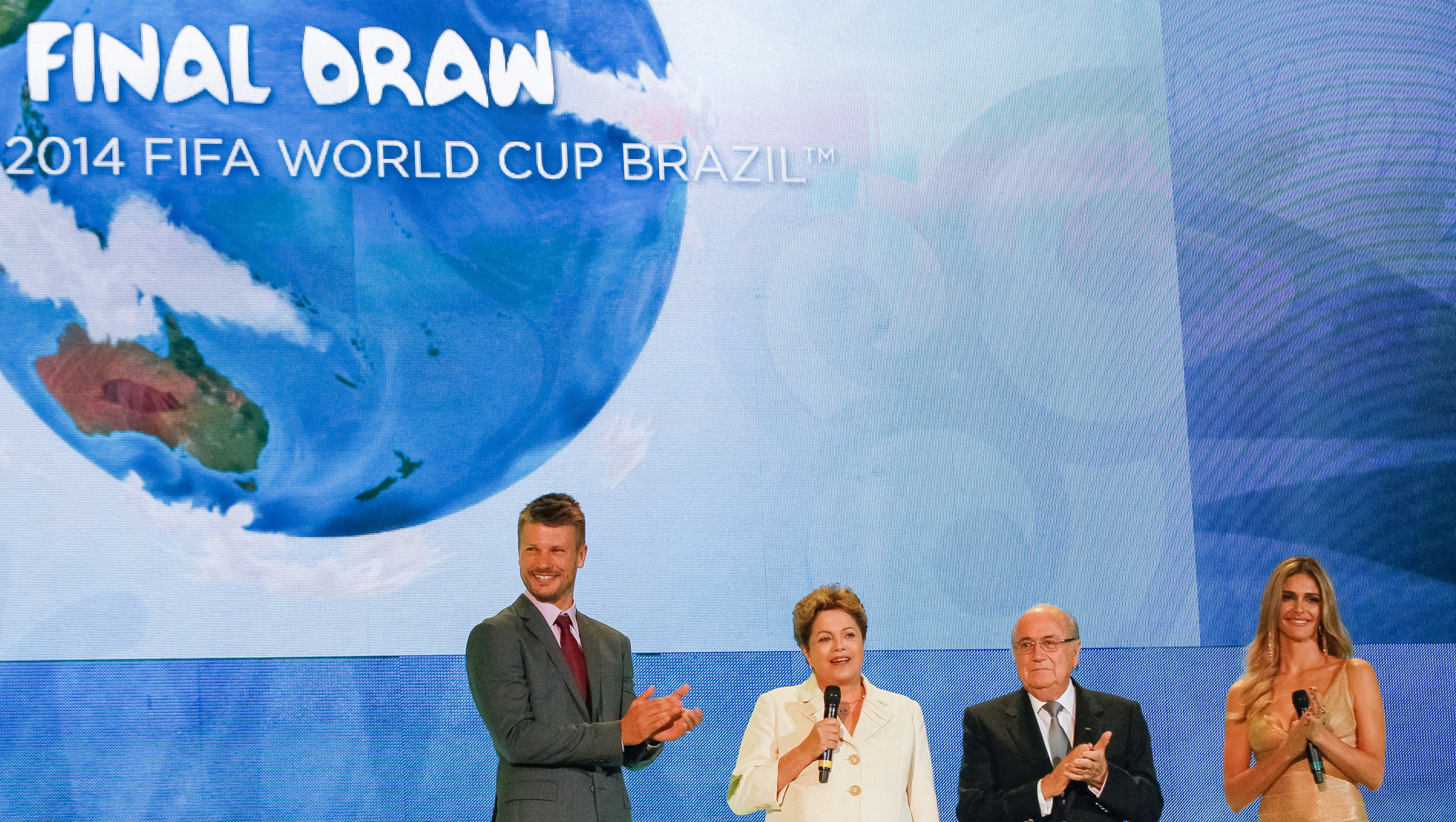 호드리고 힐베르트, 지우마 호세프, 제프 블라터 그리고 페르난다 리마가 브라질에서 열린 월드컵 결승전 추첨식에 참석했다.