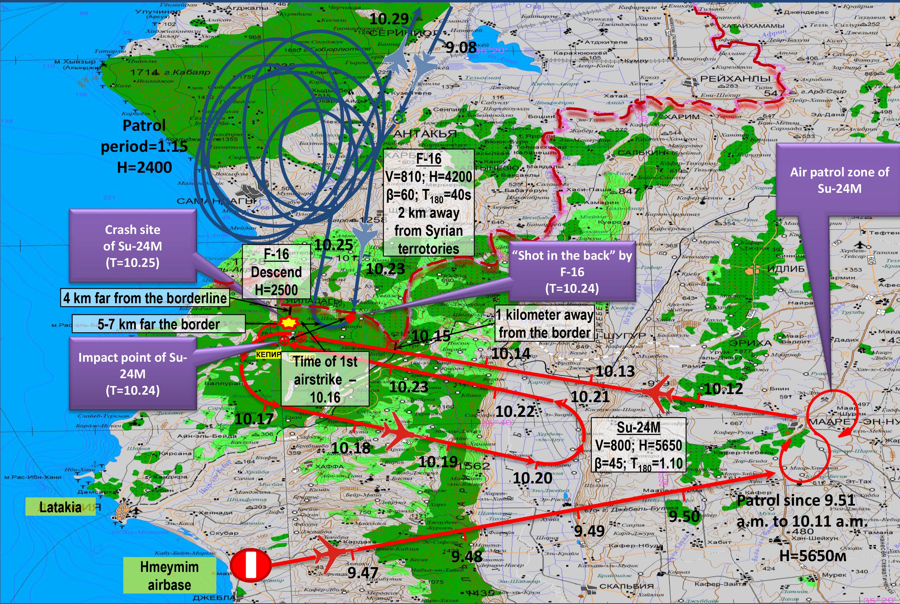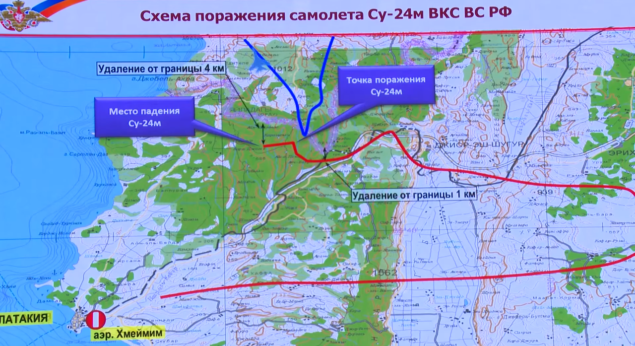 러시아 국방부는 Su-24가 시리아 내 흐메이밈 공군 기지로 귀환하던 중 터키 국경에서 1km 이내의 시리아 영공 6000m 상공에서 격추되었다고 발표했다.[46] 러시아는 해당 항공기가 시리아 영토를 벗어난 적이 없다고 주장한다.[45] 반면, 터키는 격추된 항공기가 하타이 주 남단을 지나 투르크멘 산 근처에 추락하는 모습을 보여주는 비행 패턴 그래픽을 공개했다.[49][50]