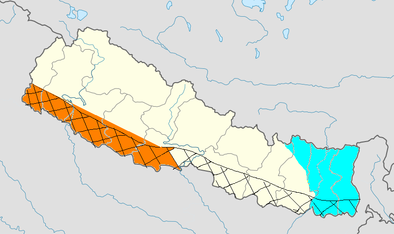 흑색 빗금: 마드헤시인이 주장하는 민족영역청색 영역: 림부완 자치지구가 주장하는 영역