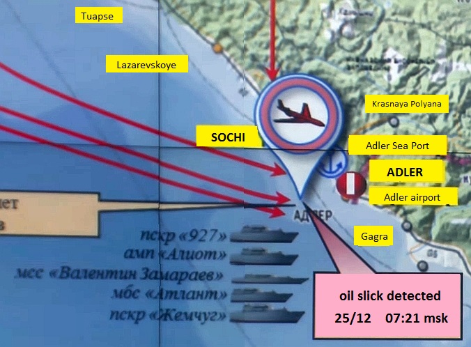 소치 해안선을 따라 설치된 감시 카메라에는 사고 직전 밝은 섬광이 포착되었다.[16] 목격자들은 비행기가 고도를 높이는 데 어려움을 겪다가 180도 회전하여 하강, 바다로 추락했다고 진술했다.[17][18]