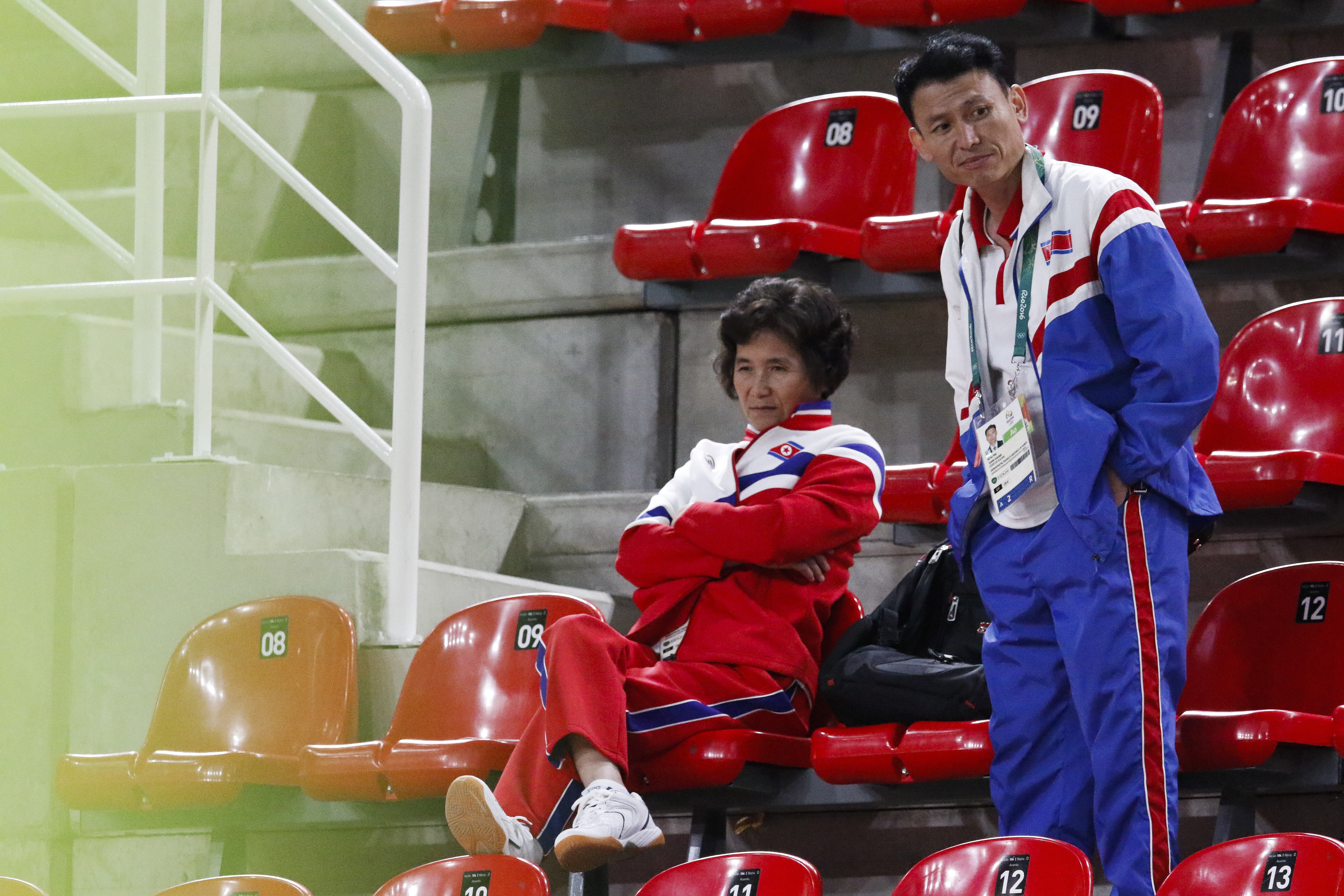 북한 선수들이 2016년 하계 올림픽 체조 훈련 세션을 지켜보고 있다.