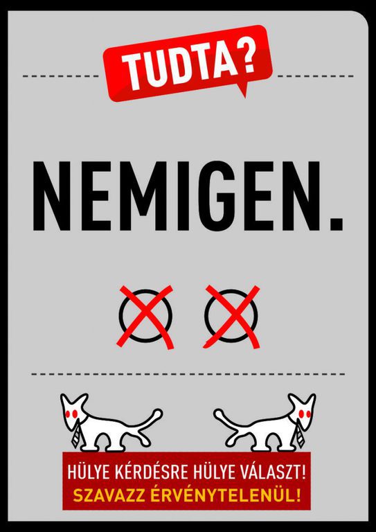 헝가리 두 꼬리 개당(MKKP)은 정부의 반(反)이민 캠페인을 조롱하고, 무효표 투표를 장려하는 운동을 전개했다. 이들은 4,000명의 자발적 기부자로부터 100000EUR를 모금하여[108] "시리아에 전쟁이 있다는 것을 알고 계셨습니까?", "헝가리인 100만 명이 유럽으로 이민 가기를 원한다는 것을 알고 계셨습니까?" 등의 풍자적인 슬로건을 담은 포스터를 제작했다.[44] 게르게이 코바치 당 대표는 BBC 뉴스와의 인터뷰에서 "정부 캠페인에 화가 난 헝가리 국민 수백만 명에게 호소하고 싶다"며, 무효표를 던져 정부에 대한 불만을 표현할 것을 촉구했다.[44]