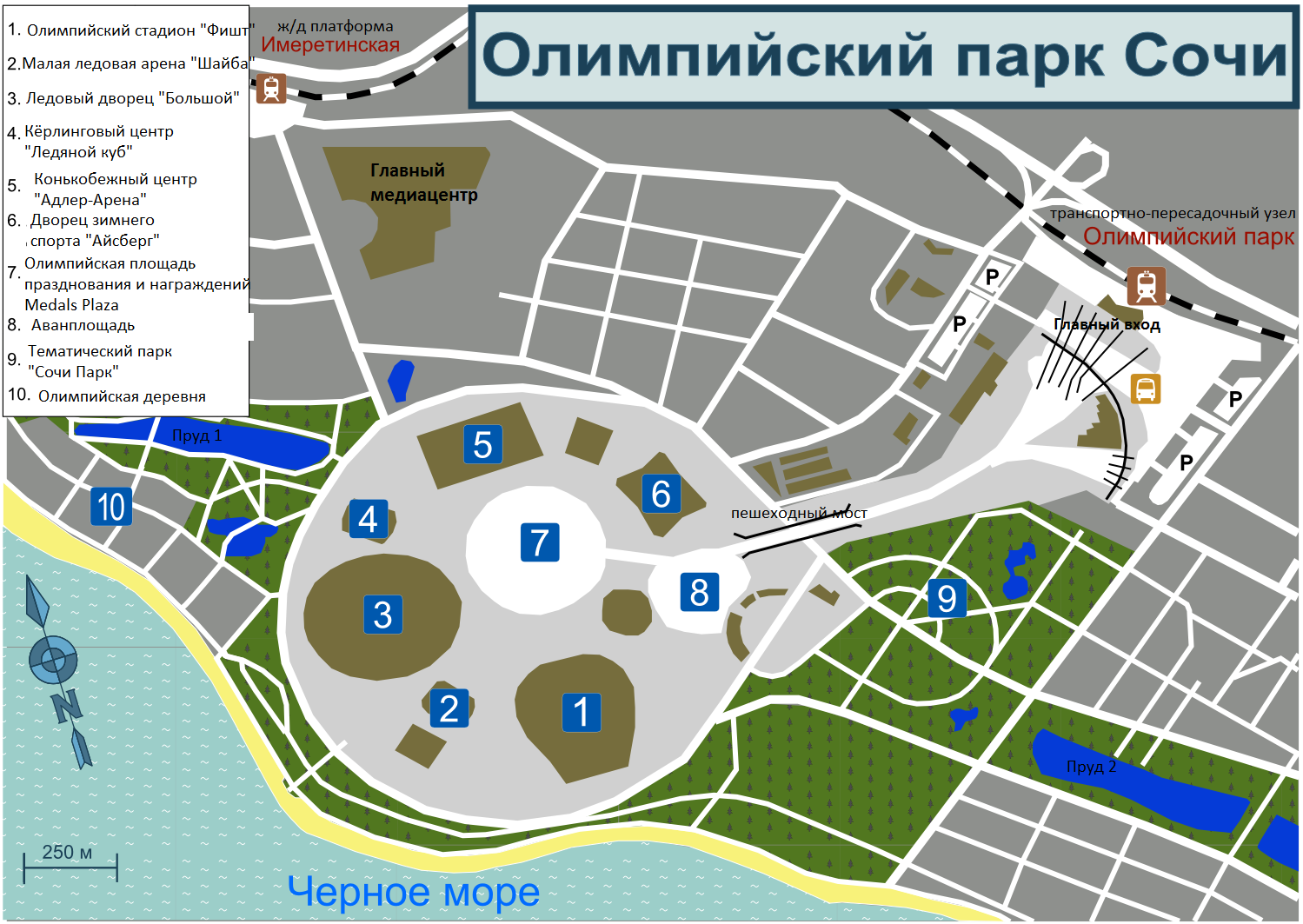 스포츠 단지는 두 개의 클러스터, 즉 올림픽 공원과 크라스나야 폴랴나로 구성되어 있다.[2]