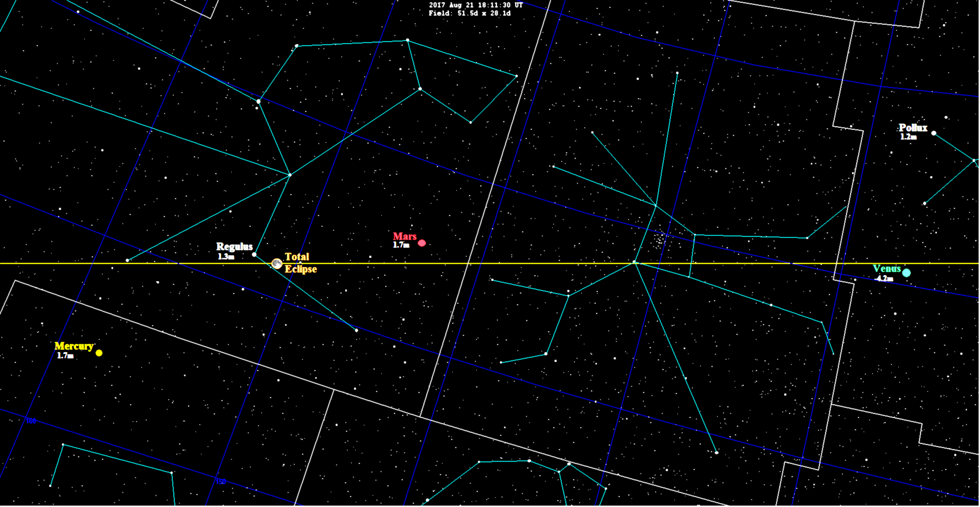 개기 일식 동안 여러 밝은 별과 행성들이 관측되었다.[16] 레굴루스 별자리는 태양과 거의 일직선상에 위치했다.[16] 화성은 오른쪽으로 8°, 금성은 오른쪽으로 34°에 위치했으며, 수성은 왼쪽으로 10°, 목성은 왼쪽으로 51°에 위치했다.[16]