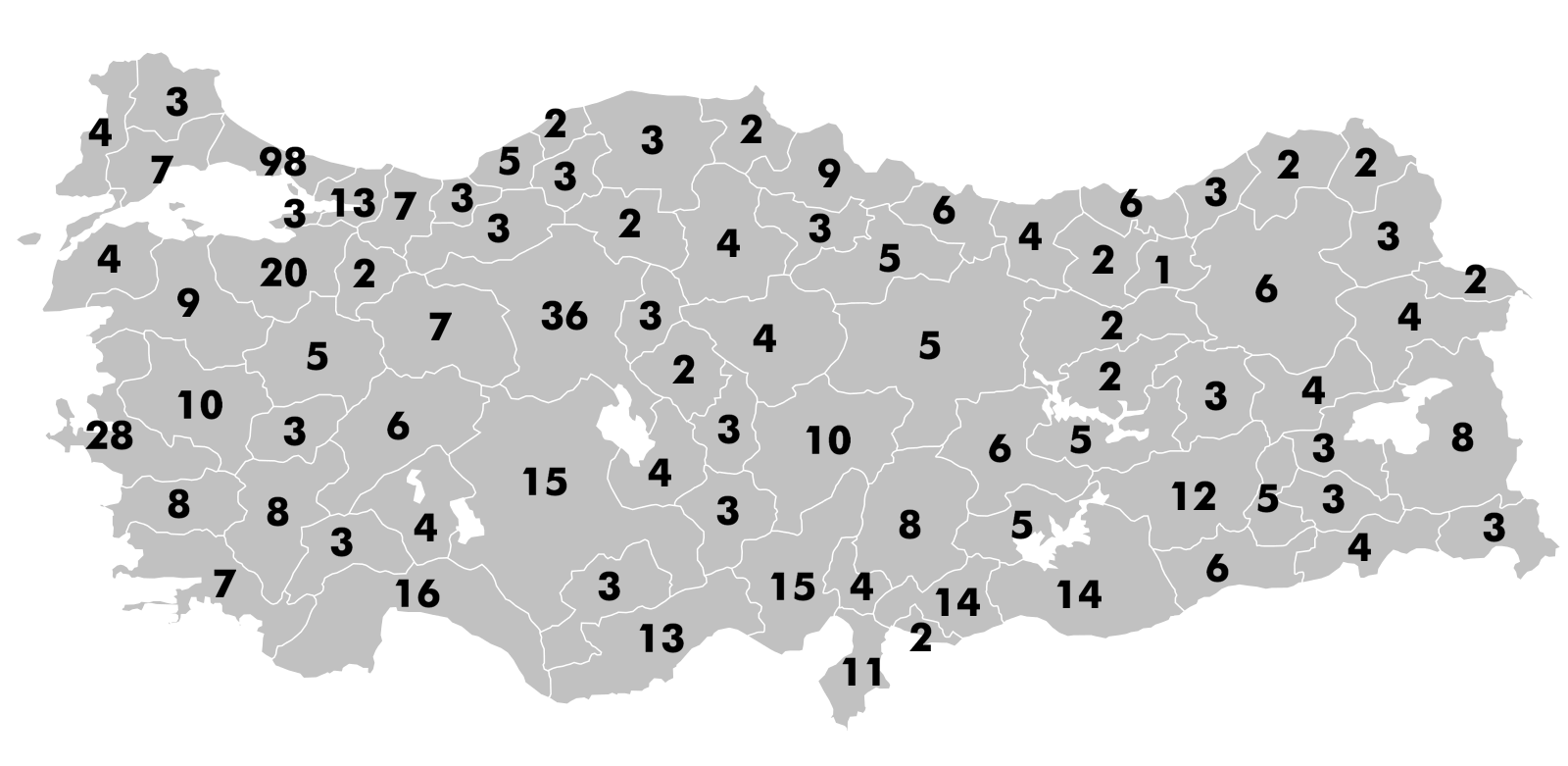 2015년 11월 튀르키예 총선 이후 튀르키예 최고 선거위원회는 총 34개 선거구의 의원수를 조정했다. 앙카라 주의 2개 선거구는 3개 선거구로, 부르사 주 선거구는 2개 선거구로 분할되었다.