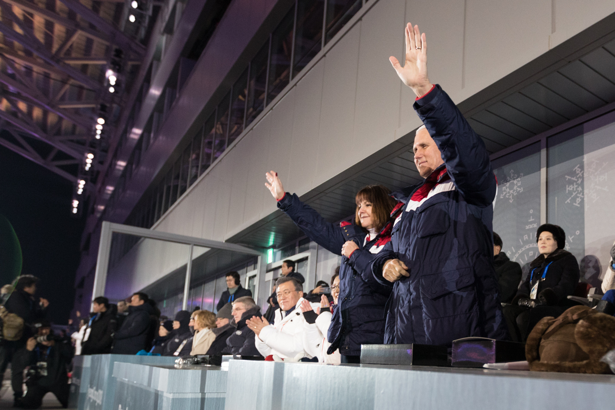 - 북한에 억류되었다가 의식 불명 상태로 귀국 후 사망한 미국인 학생 오토 웜비어의 아버지가 마이크 펜스 부통령의 초청으로 개막식에 동행하며 펜스 부통령 부부와 함께 참석했으며[156], 개막식 직전에 펜스 부통령과 함께 탈북자와 면담했다.[157]