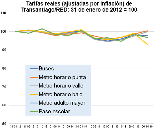 2012년 1월 31일부터 2019년 10월 6일까지 산티아고 대중교통 요금(인플레이션 조정). 마지막 인상은 철회되었다.