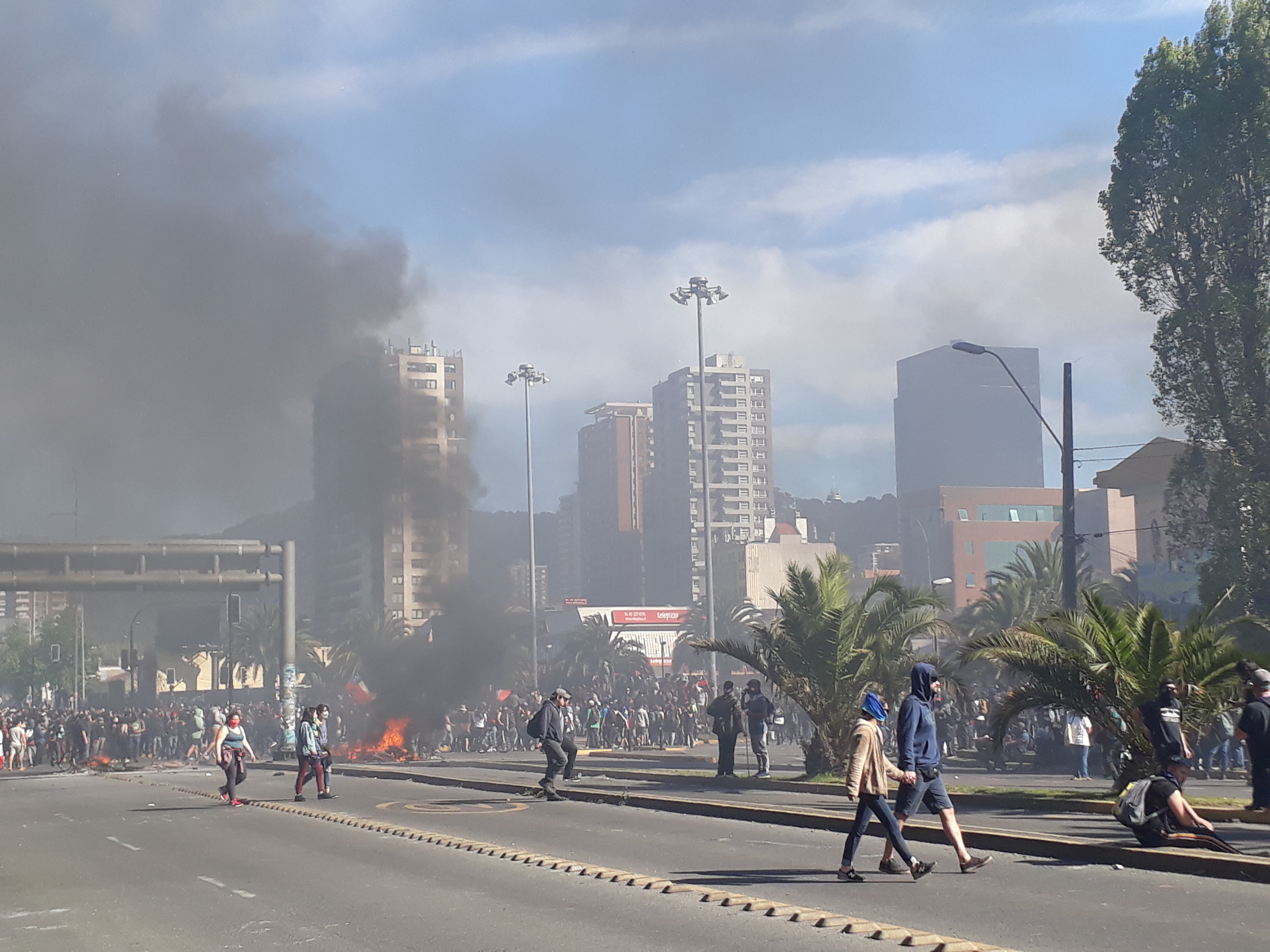 10월 18일, 산티아고 시내에서는 격렬한 시위가 벌어져 바리케이드가 설치되고, 경찰은 물대포와 최루탄으로 대응했다. 거의 모든 지하철역이 공격받아 전체 지하철 시스템이 폐쇄되었고, 에넬 헤네라시온 칠레 전기 회사 본사 건물과 여러 지하철역이 화재 피해를 입었다.[74][75]