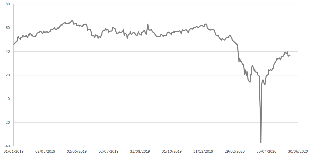 4월 20일, 5월 인도분 WTI 원유 가격은 수요 감소와 저장 능력 부족으로 인해 사상 처음으로 마이너스 영역(-37USD/배럴)으로 떨어졌다.