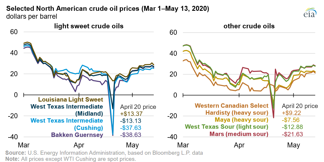 4월 20일, 5월 인도분 WTI 원유 가격은 사상 처음으로 마이너스 영역(-37달러/배럴)으로 떨어졌다. 이는 수요 감소와 저장 능력 부족, 특히 오클라호마주 커싱 지역의 저장 시설 부족 때문이었다. 4월 24일, 커싱의 저장 용량은 81%에 도달했다. 휘발유 가격도 하락했다.