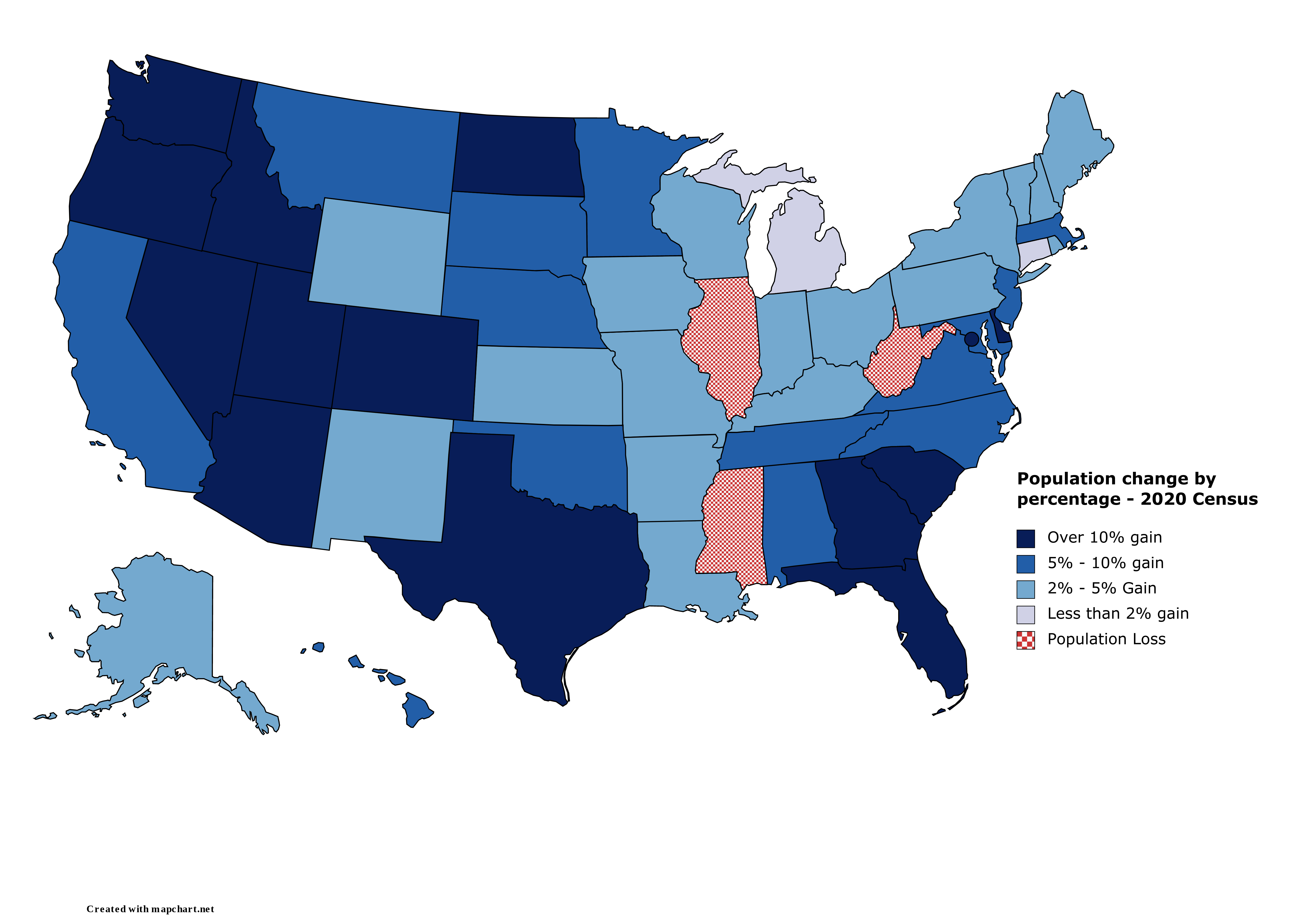 2020년 미국 인구 조사에서 주별 순위는 다음과 같다. 2010년 대비 2020년 인구 변화를 기준으로 순위를 매긴다.[149]