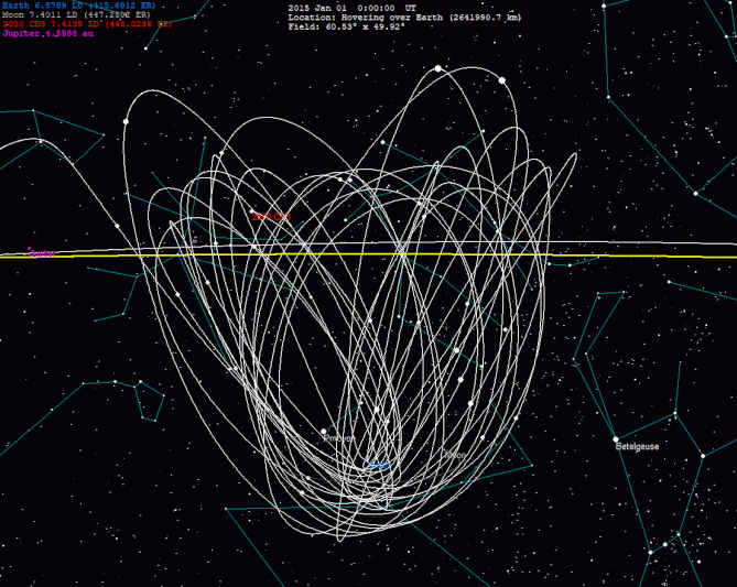 2020 CD3의 지구 주위 궤도는 매우 가변적이고 이심률이 높아서, 2017년 중반 이전의 과거 궤도 예측은 작은 소행성에 대한 야르콥스키 효과와 지구 및 달과의 수많은 접근 때문에 불확실하다. 이러한 불확실성으로 인해 2015년 크리스마스에 소행성이 달보다 더 가까이 있었는지 여부는 계산 방법에 따라 다르다.