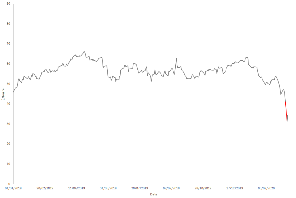 코로나바이러스감염증-19 유행으로 여행 수요와 공장 운영이 급감하면서 석유 수요도 크게 줄어 유가가 하락하였다.[622] 2월 중순 국제 에너지 기구는 2020년 석유 수요 증가율이 2011년 이후 최저치를 기록할 것이라고 전망했다.[623] 중국 내 전염병 유행으로 인한 수요 급감으로 석유 수출국 기구(OPEC)는 석유 공급 감소에 대한 논의를 시작했다.[624] OPEC는 2020년 3월 5일 빈에서 열린 회의에서 이라크 전쟁 이후 최저 수준인 하루 150만 배럴씩 석유 생산량을 줄이겠다고 합의했다.[625]하지만 3월 8일, 러시아와 사우디아라비아 간 감산 협상이 결렬되자 사우디아라비아는 원유 생산량을 늘리고 아시아, 북미, 유럽 고객들에게 4월물부터 배럴당 6~8달러씩 할인된 가격에 판매할 것이라고 발표했다.[747] 발표 전 이미 연초 대비 30% 이상 하락했던 유가는 사우디의 발표 이후 추가로 30% 이상 하락하였다.[626][627] 세계 원유 공급량의 2/3를 차지하는 브렌트유 가격은 걸프 전쟁 직후인 1991년 3월 8일 밤 이후 가장 큰 폭으로 폭락했다. 서부 텍사스 중질유(WTI) 가격은 2016년 2월 이후 최저치로 내려갔다.[628] 에너지 전문가 밥 맥널리는 "이는 1930~31년 엄청난 수요 감소와 함께 맞이한 공급 충격 이후 처음"이라고 말했다.[629] 그는 1930년대 동부 택사스 유전으로 생긴 텍사스 오일 붐과 대공황 시기 스무트-헐리 관세법으로 인한 국제 무역 붕괴가 수요 감소와 공급 충격에 해당한다고 설명했다. 러시아-사우디아라비아 간 유가 전쟁으로 미국 증시가 급락했으며, 특히 미국 내 셰일 오일 사업자에게 큰 충격을 주었다.[630]
