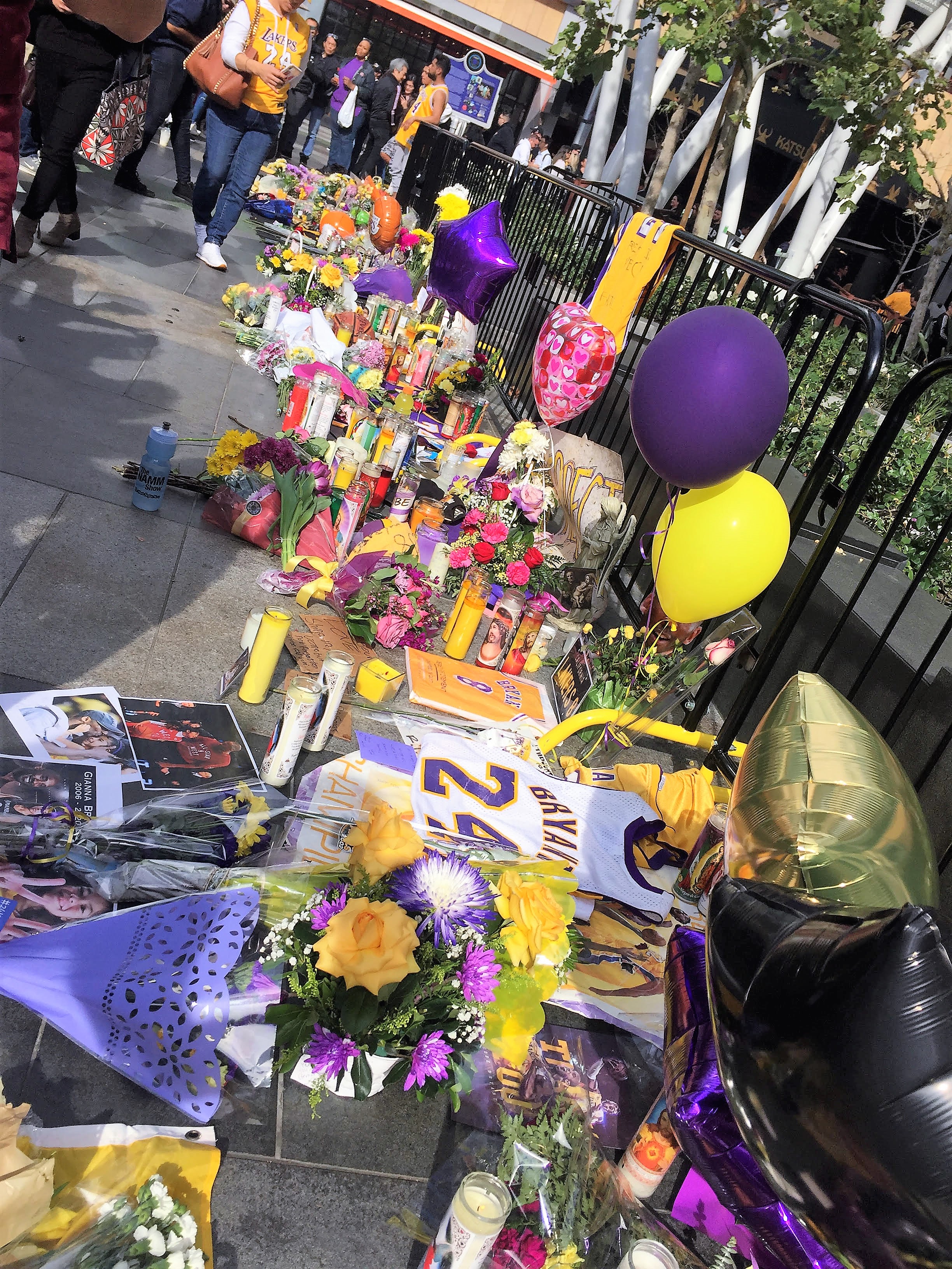 스테이플스 센터(현 크립토닷컴 아레나) 밖에는 브라이언트의 사망 소식이 전해진 직후 임시 추모 시설이 마련되었다. 이곳은 브라이언트가 1996년부터 2016년까지 20년간 NBA 선수 생활을 한 로스앤젤레스 레이커스의 홈 경기장이었다. 사고 당일은 제62회 그래미상 시상식이 열리기 불과 몇 시간 전이었다.[89] 시상식에서는 진행자 앨리샤 키스와 보이즈 투 멘이 브라이언트를 기리는 "It's So Hard to Say Goodbye to Yesterday"를 공연했다.[90] 릴 나스 엑스, 리조, 런-DMC, 에어로스미스, DJ 칼레드 등 다른 공연자들도 공연에 브라이언트에 대한 헌사를 포함시켰다.[90] 스테이플스 센터 지붕에 걸린 브라이언트의 두 개의 은퇴 유니폼(8번, 24번)에는 조명이 비춰졌다.[91]브라이언트 사망 일주일 후, 스테이플스 센터 직원들은 경기장 밖 임시 추모 시설을 정리하기 시작했지만, 썩지 않는 모든 물품들을 목록화하고 포장하여 그의 가족에게 배송하겠다고 약속했다.[92] 이 과정에서 수집된 물품에는 1,350개의 농구공, 25,000개의 촛불, 5,000개의 표지판 또는 편지, 500개의 봉제 인형, 350켤레의 신발, 14개의 현수막 등이 있었다.[92]