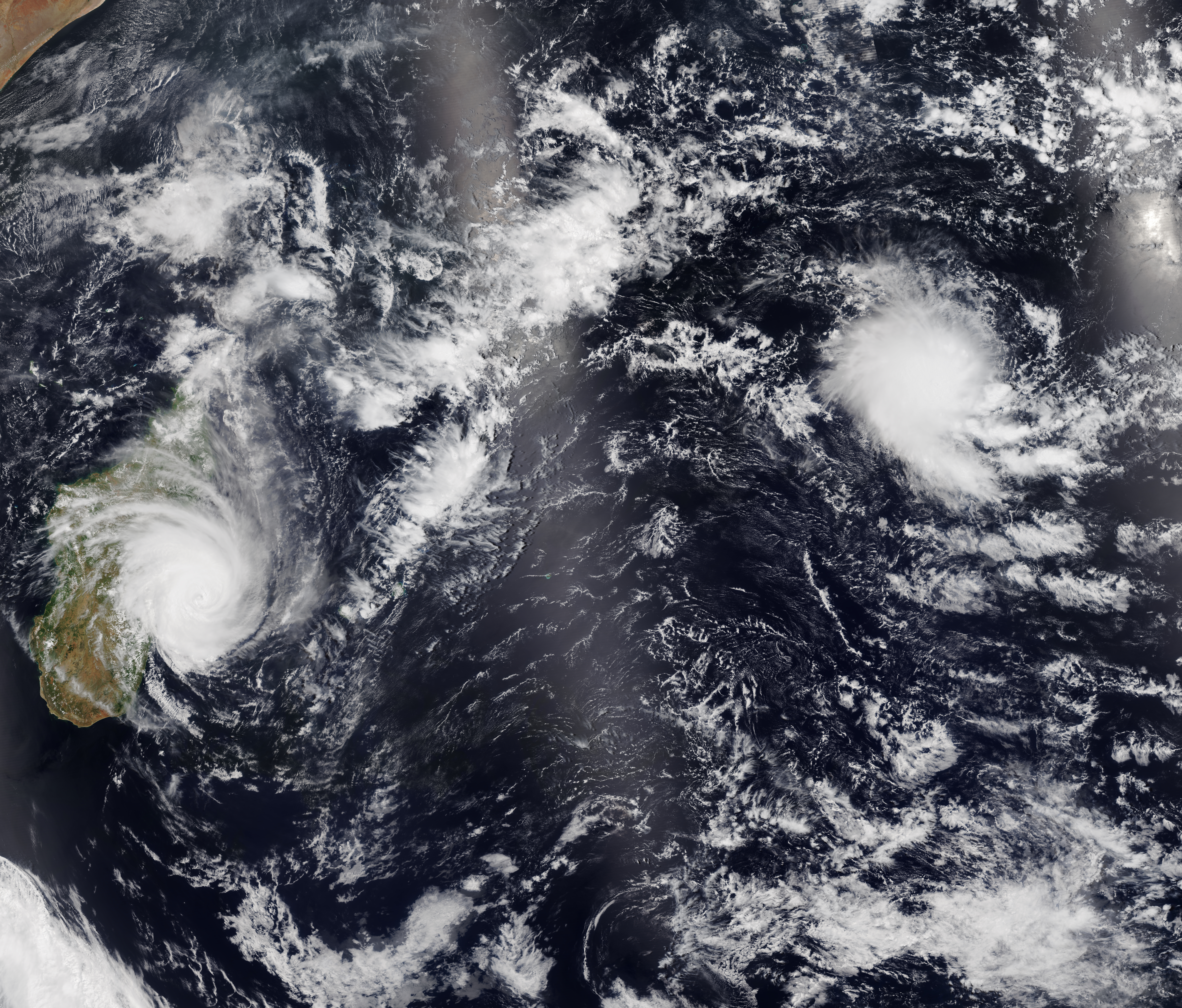 2월 21일 마다가스카르에 접근하는 사이클론 프레디(왼쪽)와 나중에 사이클론 에날라로 발달한 열대 저기압(오른쪽).