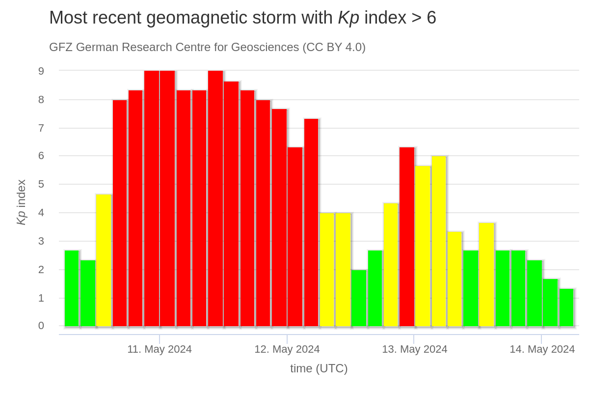 2024년 5월 11일의 ''A''p 지수는 271로, 1989년 3월 13일과 14일의 ''A''p 지수보다 높았고, 2003년 10월 29일과 30일, 11월 20일의 ''A''p 지수보다 훨씬 높았으며, 1960년 11월 13일의 ''A''p 지수 280에 이어 역대 두 번째로 높았다.[18]