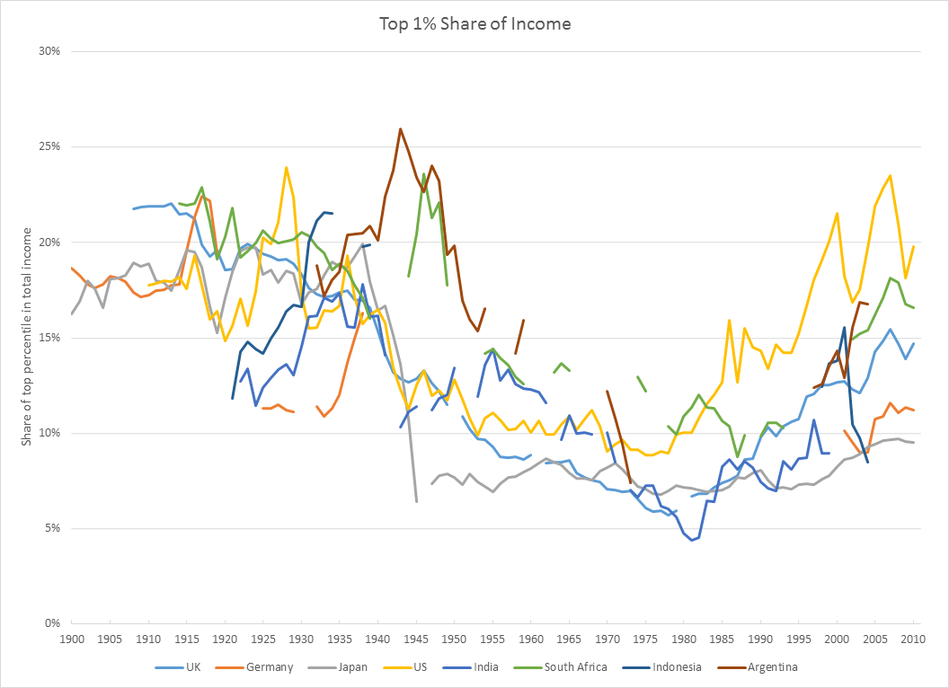 이 책은 1930년과 1975년 사이에 두 차례의 세계 대전과 대공황, 부채로 인한 경기 침체 등 독특한 상황 때문에 더 높은 불평등의 추세가 역전되었다고 주장한다.[163][20] 이러한 사건들은 정부가 특히 제2차 세계 대전 이후에 소득을 재분배하는 조치를 취하도록 촉진했다. 그 당시의 빠르고 세계적인 경제 성장은 세계 경제에서 상속된 부의 중요성을 감소시키기 시작했다.[163]