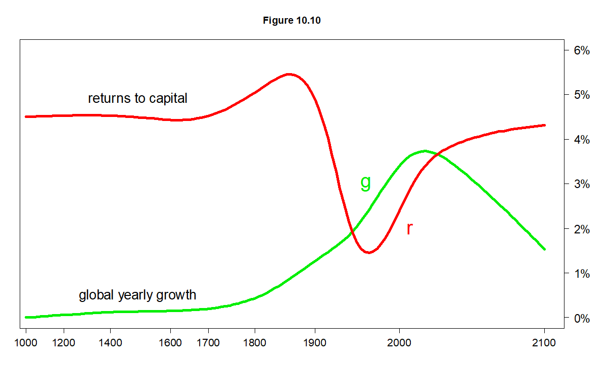 피케티는 세금 조정을 하지 않으면 경제성장률이 낮고 불평등이 극심한 세계를 예측한다. 그의 자료는 장기간에 걸쳐 평균 투자 자본 수익률이 생산성 기준 소득을 큰 폭으로 능가한다는 것을 보여준다.[20]