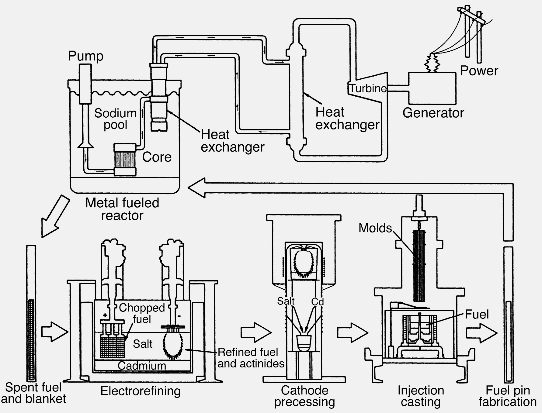 SFR 원자로는 액체 나트륨으로 냉각되고, 우라늄과 플루토늄 또는 사용후 핵연료의 금속 합금을 연료로 사용한다. SFR 연료는 강철 피복재에 담겨 있으며, 액체 나트륨은 연료 집합체를 구성하는 피복재 요소 사이의 공간을 채운다. 나트륨은 물과 접촉하면 폭발적으로 반응하는 위험이 있지만, 액체 금속을 냉각수로 사용하여 시스템을 대기압에서 작동시켜 누출 위험을 줄인다.